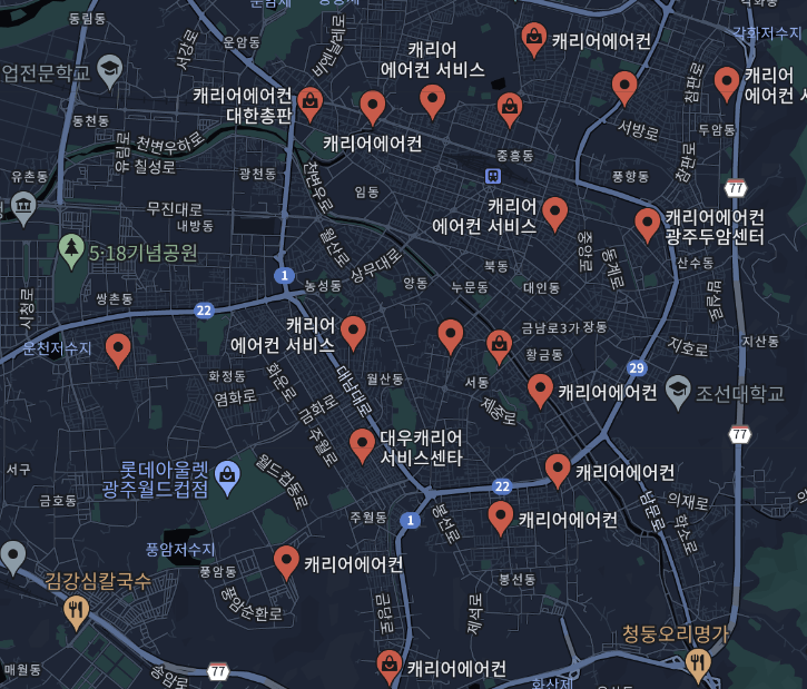 광주에는 캐리어 서비스센터가 많이 있습니다! 은근 서비스센터가 많아서 각 구마다 한 개씩 알려드리겠습니다. 지도로 봤을 때는 각 구마나 2~3개 정로 있는 거 같습니다!